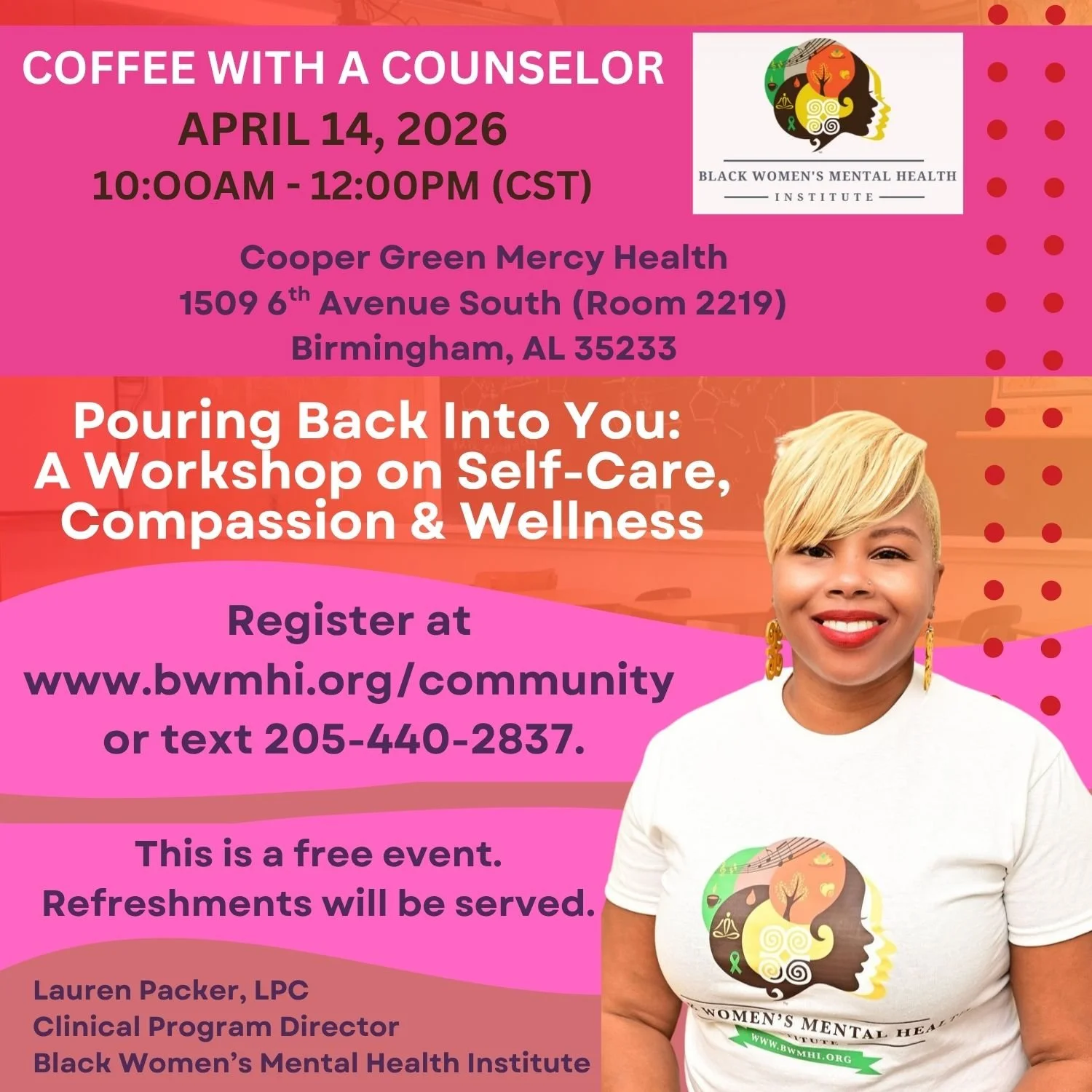 The Black Women's Mental Health Institute is excited to partner with Cooper Green Mercy Health Services to host Coffee with a Counselor.