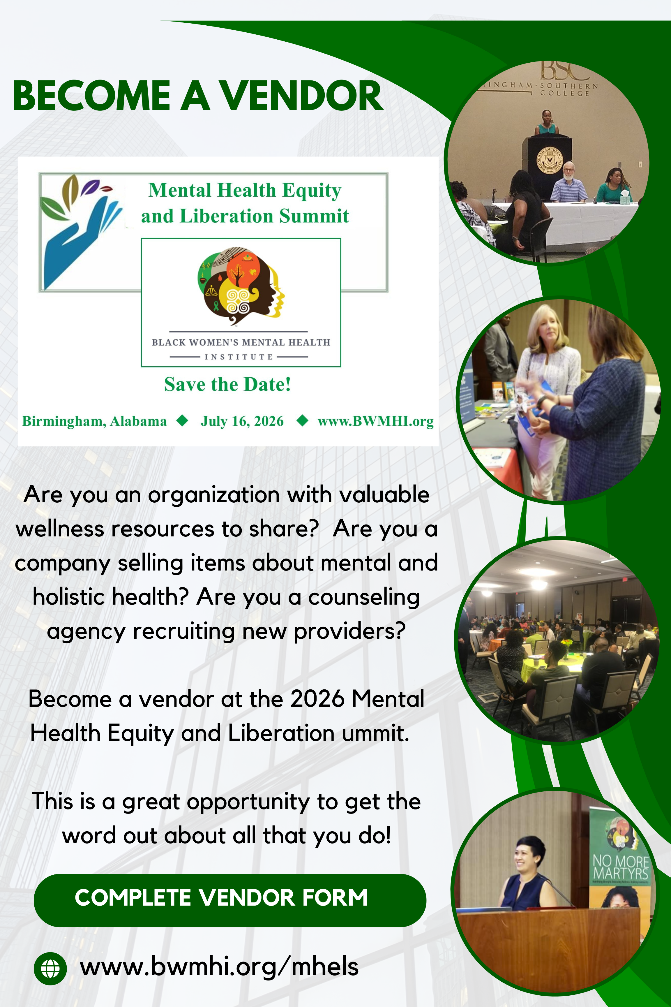 Are you an organization with valuable wellness resources to share? Are you a company selling items about mental and holistic health? Are you a counseling agency recruiting new providers? Become a vendor at the 2026 Mental Health Equity and Liberation Summit. This is a great opportunity to get the word out about all that you do!