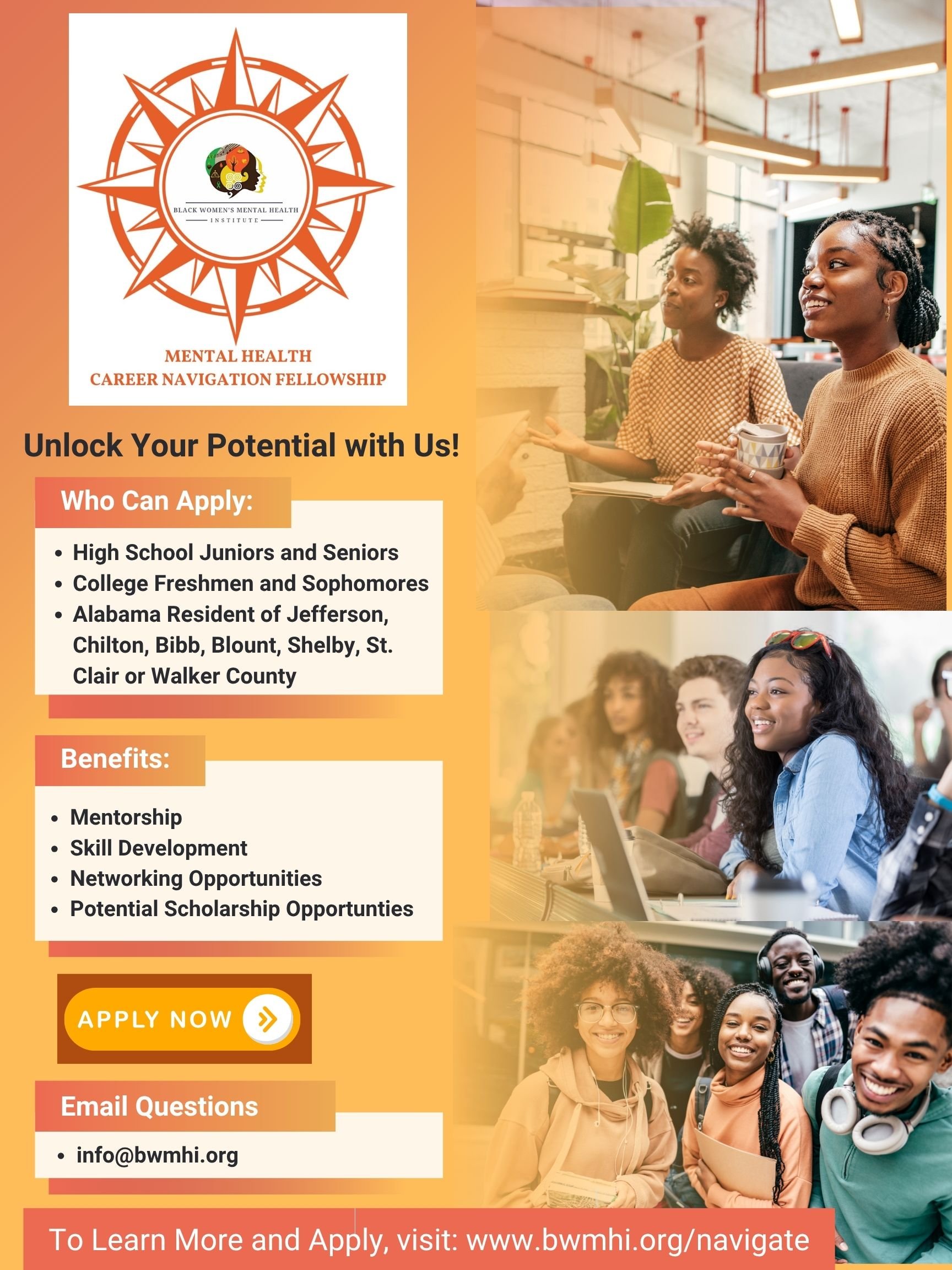 The Mental Health Career Navigation Fellowship is a hybrid student program open to and serving high school juniors and seniors as well as college freshmen and sophomores in Bibb County, Blount County, St. Clair County, Chilton County, Walker County, Shelby County and Jefferson County (Alabama).