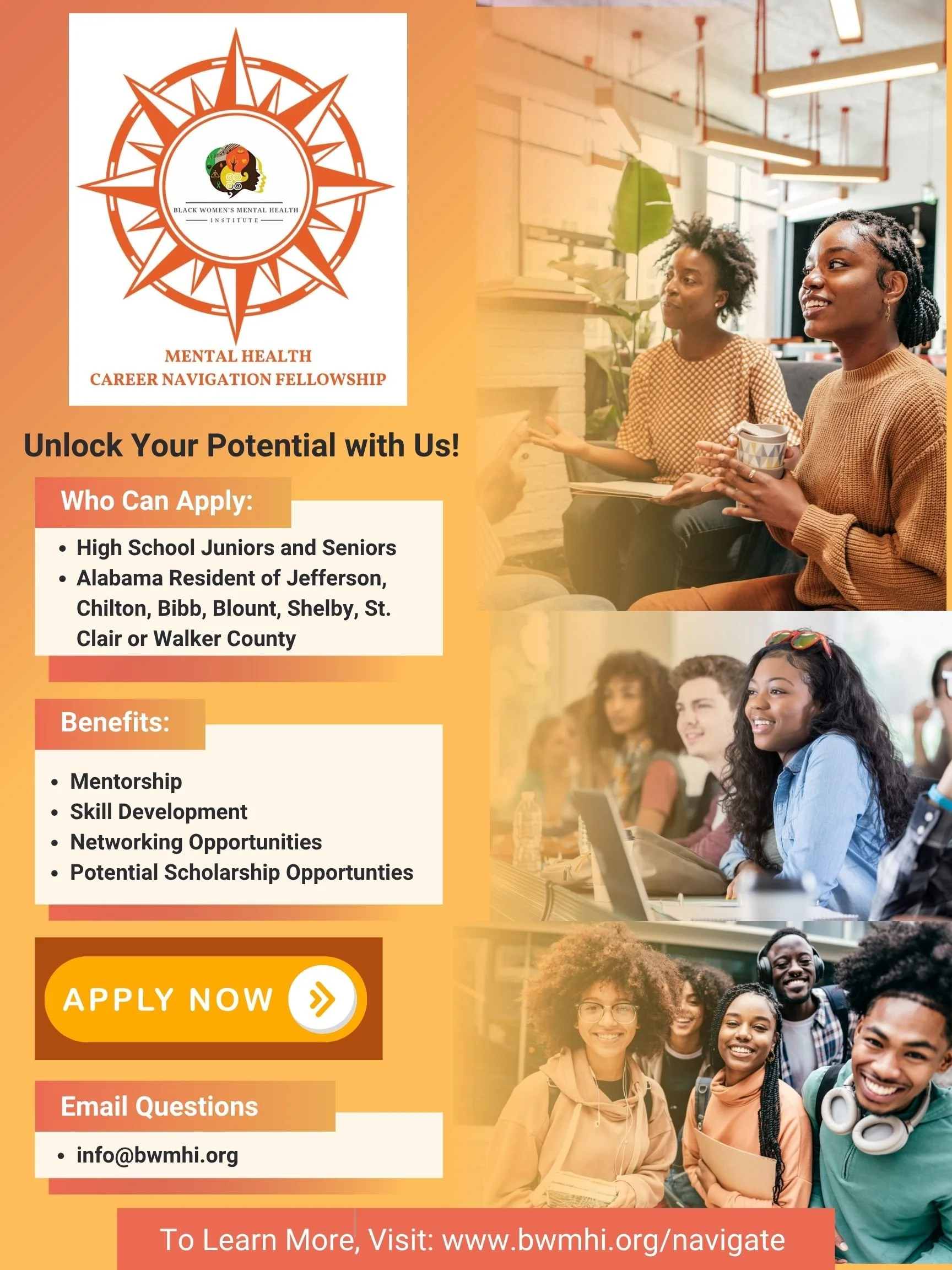 The Mental Health Career Navigation Fellowship is a hybrid student program open to and serving high school juniors and seniors in Bibb County, Blount County, St. Clair County, Chilton County, Walker County, Shelby County and Jefferson County (Alabama).