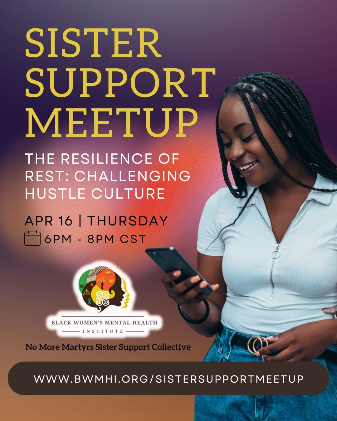 The No More Martyrs Sisterhood Support Collective is an online community of support for Black women and girls managing mental health concerns. It is housed within the Black Women's Mental Health Institute. Please join us for our monthly Sister Support Meetup. Come out for encouragement from women sharing their stories. Learn recovery strategies for living successfully with mental health concerns and get connected to valuable resources and information.
